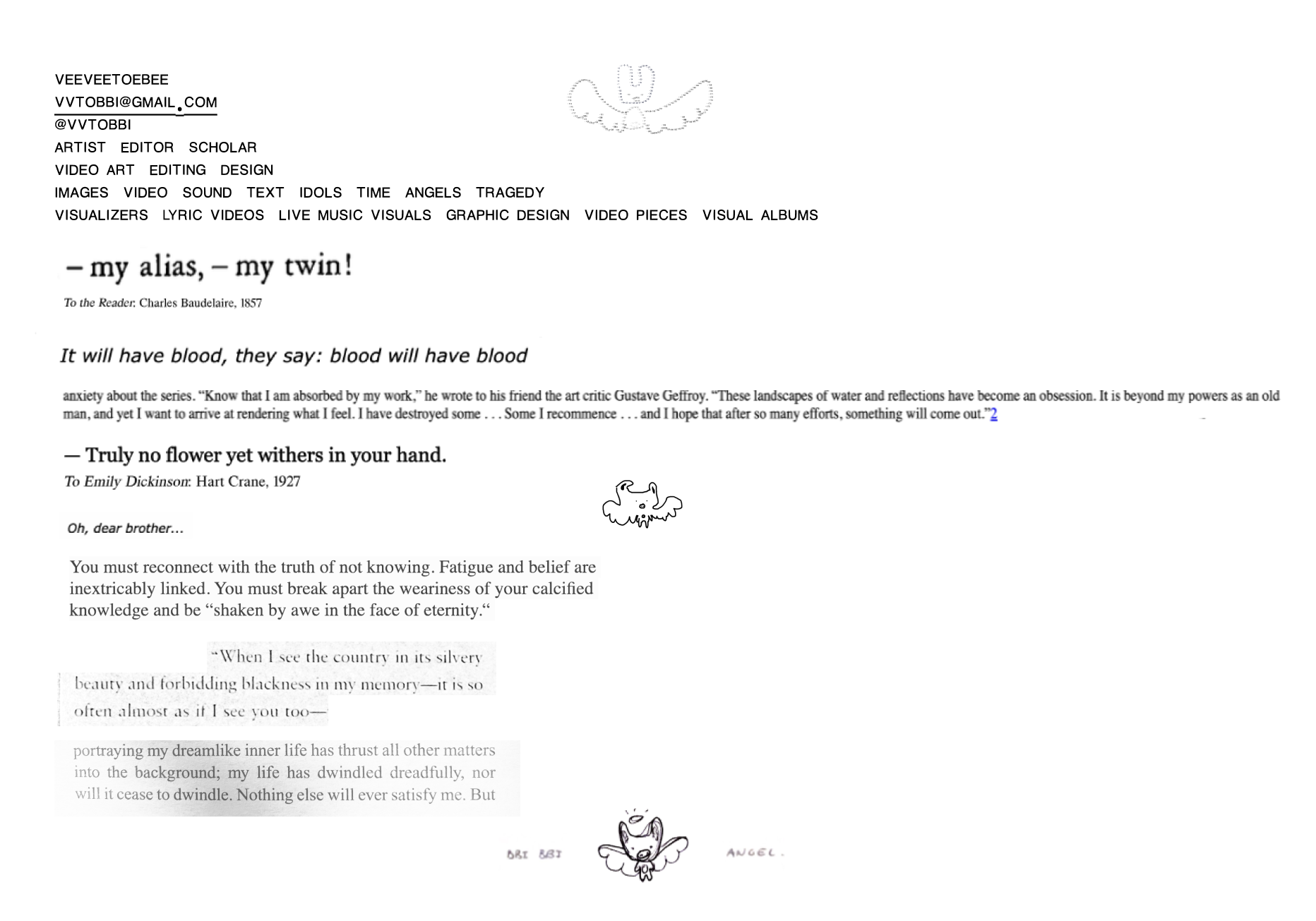 video visual + bb like baby. bbythewindow. even if you’re not there. i’ll think that you’re next to me. the thing that will last and be reliable is your own skills. endure loneliness. loyalty to work. no one will compare to you. you can’t win over time. time kept going. ultimate image formation. compiling desire and letting it die. you want it all. you're always one step ahead. where you belong. you are the one. everything exists here. like you’ve captured the memories yourself. i will always have a place for you in my world. i always hope to see you again. you haven’t seen it how i see it. i can’t see you, but i know you’re here. you didn't show up. i kept waiting. even if this isn’t real, it doesn’t matter, it’s real to me. spirit of the image. what traces of that can be left behind. for the solitary. why try to catch an always fleeing image? if i do not keep busy at such an idle occupation, how can i enjoy this limited life? new form. at my way of looking. something’s happening. no one sees now along the mountains, but all may hear, for voice is living. if i could only escape from my own body. i want to be loved for a long time. angels don’t cry. create another existence. you are the light of my eyes. angels i’ve made. all in divine timing. then. worldwide. you feel like you are them and they are you. vanitas. winged genius. Confidence born of consistent work destroys doubt. god from the machine. we’re always watching over from afar. following my dream. heaven is guiding. i couldn’t love you more. i would go on forever, for eternity to reach you. i would express this a million times over and it wouldn’t be enough. at any given moment, the world offers vastly more support to work it already understands - namely, art that's already been around for a generation or a century. expressions of new ideas often fail to qualify as even bad art - they're simply viewed as no art at all… didn't fit within the established definition of art. capturing and engaging. haunting horror of a glutton of image. Baudelaire would love this. the whole answer is there. and dreadfully distinct. i spend time making things as if i will live forever. it’s only love that gets you through. the angels must have sent and meant you just for me. what do you even know. for one evening he bent towards you his head. you received at his feet his immortal farewell. immortal beloved. for if we could not take the place of God, how could we fill the space we had created within ourselves? angel of my heart. mavoureen, my beloved. Hard work is the only reasonable avenue toward peace of mind and self worth. i hadn’t expected winter to come so soon. all the melodies and stories are just after images of you. work that leads me towards things i never even imagined. a pity you’re not here with me. you would understand everything. so that he will move around himself as his own true sun. fate comes when it will, and thus we are ready.i never ask advice from him because what could he know? a mysterious greatness emanates from this group. one doesn’t dare assign a meaning to it. a heaven is near, but is not yet attained; a hell is near, and not yet forgotten. eternal idol. acme. a practice is not always about answers but often proper distractions are far more important. without haste and without rest. who, in eighteen centuries, has had the common humanity to pray for the one sinner that needed it most? no flower yet withers in your hand. there was no trace of suffering on her face. no trace of regrets, she seemed completely at peace. it made sense to me, but it was also slightly terrifying. a cd and a video...nekojiru had written to do so in her will. if god is two people holding hands and angels can share our faces. i don’t care about what is reality. that’s not the point. eternal bloom. dreams come true. Saint, lover, artist: surely these are all good ways of being. Probably though, we’ll keep arguing about them forever. élan vital, the emergent life forces of all origination. To properly use/orient the creative forces of this world one first must understand limitation and context. “It is the phenomenon sometimes called alienation from self. In its advanced stages, we no longer answer the telephone, because someone might want something; that we could say no without drowning in self-reproach is an idea alien to this game. Every encounter demands too much, tears the nerves, drains the will, and the spectre of something as small as an unanswered letter arouses such disproportionate guilt that one's sanity becomes an object of speculation among one's acquaintances. Emphasize patience; discourage unchecked yearning. To assign unanswered letters their proper weight, to free us from the expectations of others, to give us back to ourselves—there lies the great, singular power of self-respect. Without it, one eventually discovers the final turn of the screw: one runs away to find oneself, and finds no one at home.” this is not a giving up, but ultimate engagement. “to know” is to lie — but to participate is beauty — active loving wrongness, constant revision. onto something important. does he warrant love any more than another. “All look and likeness caught from earth, All accident of kin and birth, Had pass'd away. There was no trace Of aught on that illumined face, Uprais'd beneath the rifted stone. But of one spirit all her own ;— She, she herself, and only she, Shone through her body visibly.” no flower yet withers in your hand. passing through eternity cradling a beauty, in vain, i desire so much and let nothing wither. “Stupidity, delusion, selfishness and lust torment our bodies and possess our minds... Our sins are stubborn, our contrition lame; we want our scruples to be worth our while how cheerfully we crawl back to the mire: a few cheap tears will wash our stains away!” I don't know if this love is a sin that has any sort of punishment, or if it's breaking the